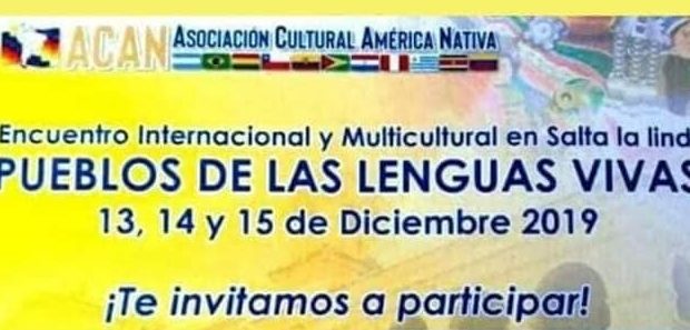 Los días viernes 13, sábado 14 y domingo 15 de diciembre se llevará a cabo en la ciudad de Salta el “Primer Encuentro Internacional, Plurinacional y Multicultural: Pueblos de las lenguas vivas”, organizado por Asociación Cultural América Nativa.